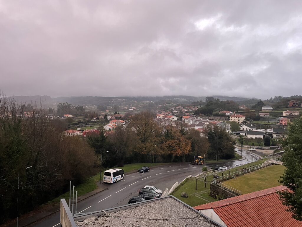 We took a diversion inland for a few miles to reach an Aire in the mountains in a large town called Parades de Couca. Not somewhere very pleasant as it turned out but a free Aire with free electricity. It was an old car park by the looks of things, run by the municipality who provided free Wi-Fi and it came recommended. I think it was a popular stop in August when they have a huge Rock festival in the town. But again it was raining most of the time which made the town looked very dreary. We walked around in the evening, but the shops were closing and Christmas music was blaring from Speakers on every street. I did get my first taste of Portuguese supermarkets – prices are looking very cheap here.