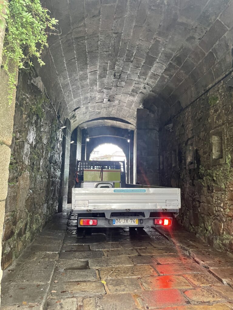 Our first stop in Portugal was literally over the border into a Fortress town called Valenca. Spain and Portugal have a natural river border in this area. The Minho River with Tui on the Spanish side and Valenca on the Portuguese side. They have built a walkway between the two so that both sides can take advantage of what each city has to offer. Due to the heavy rain, we didn’t stay very long and only visited the fortress as it literally poured with rain the whole time. The Fortress dates to medieval times and contains a walled city with houses shops and cafes within. The Shops all seem to sell various towels and linen and there are hundreds of them – interspersed was the odd wine shop or other souvenirs. It was an odd place to visit, it kind of reminded us slightly of Mont St Michel in France without the French charm! Cars and trucks were able to drive through the narrow streets and under the archways – it was amusing to watch a truck squeezing though one entrance by inches!