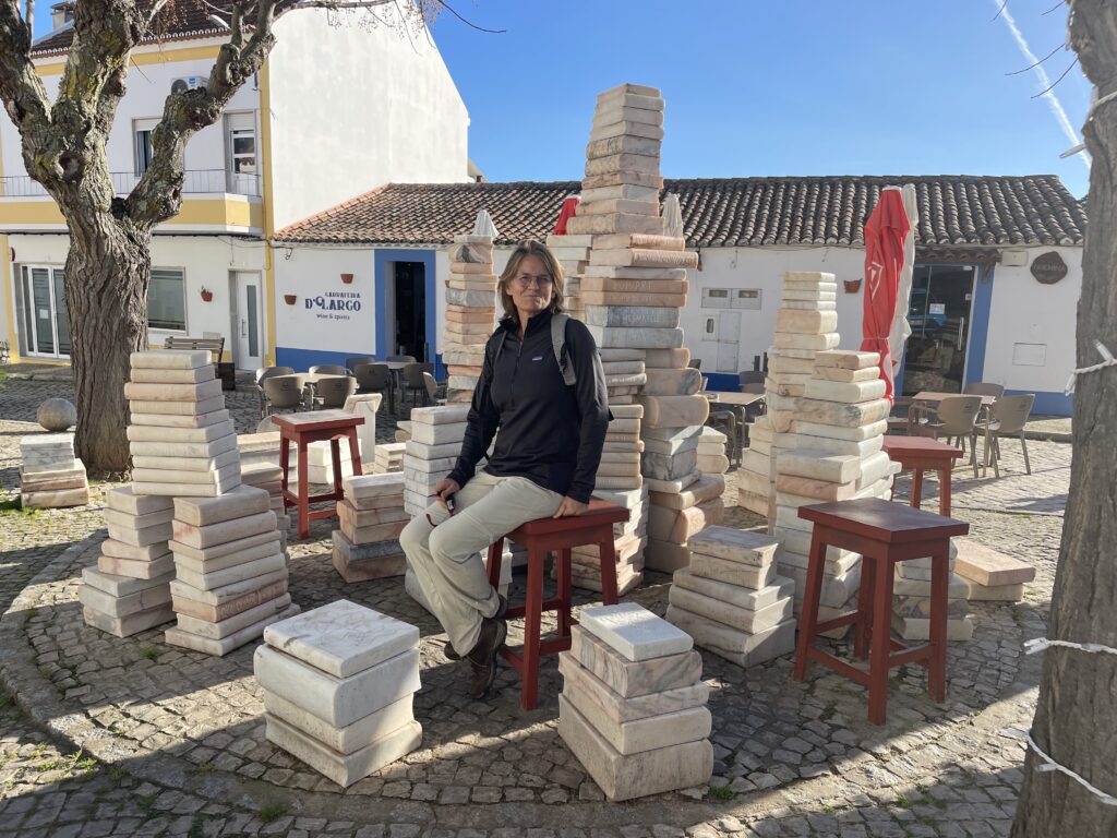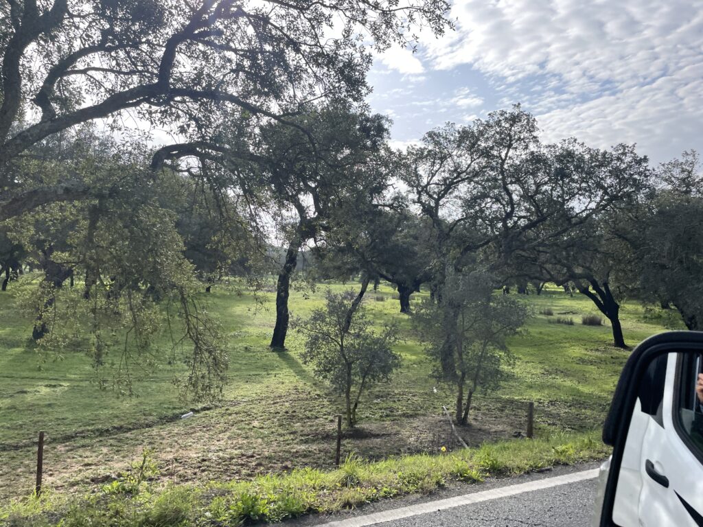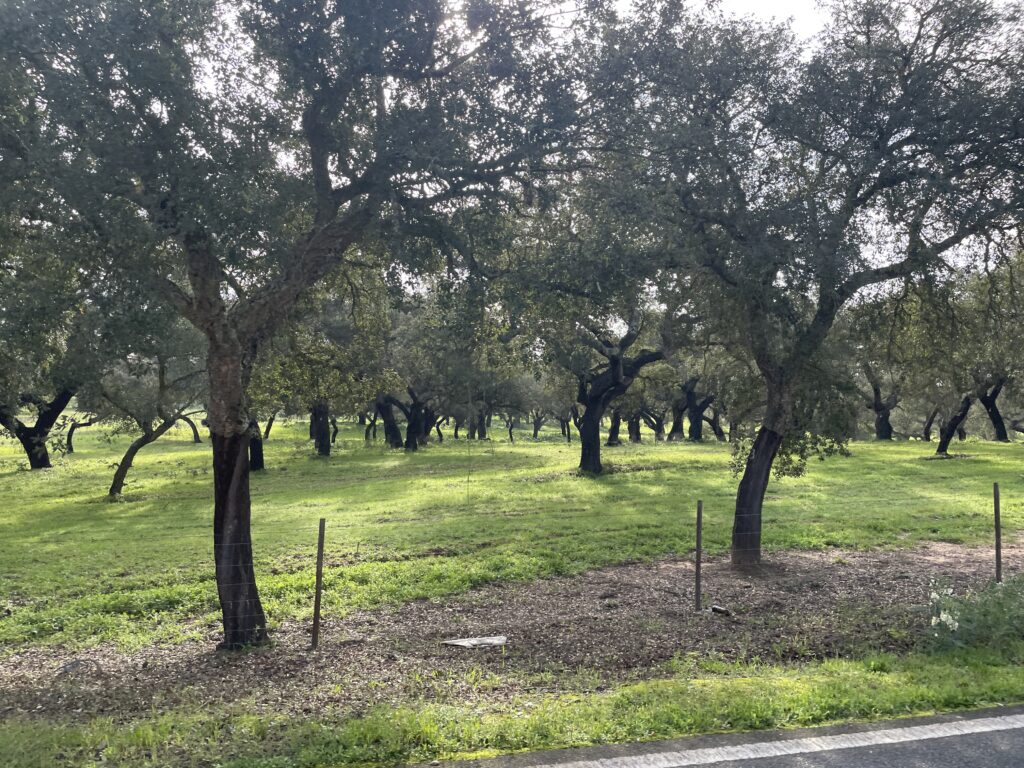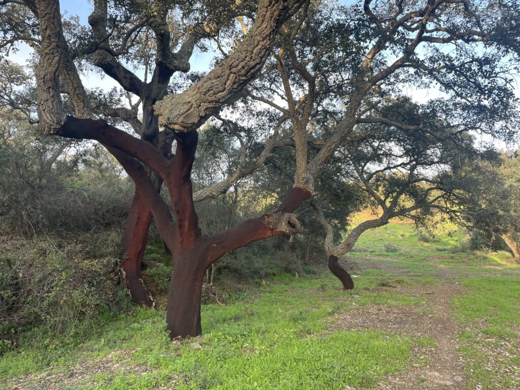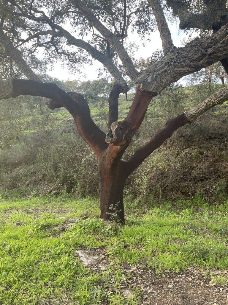 A large part of Alentejo is known for their cork production. Portugal is the world’s biggest cork producers and produces 50% of the worlds cork supply. We have passed many fields of cork oak trees and when I first spotted one of these trees with the bark stripped from it I thought maybe there were bears or wild boars in the area!! It turns out that the cork bark is very skilfully cut from the tree every nine years to enable it to grow back. They mark each tree with the last digit of the year so they know when to strip it again. Cork oaks are the only trees that don’t die when you strip them of their bark. We have passed lots of cork farms and seen piles of stripped cork drying out. Many tourist shops contain cork souvenirs in the shape of purses, bags, key rings, table mats, mugs, and some rough cork bark shaped bowls that we learnt at the museum were traditionally used as vessels for water to wash with. In the old days they used cork to make babies cradles and other different uses.