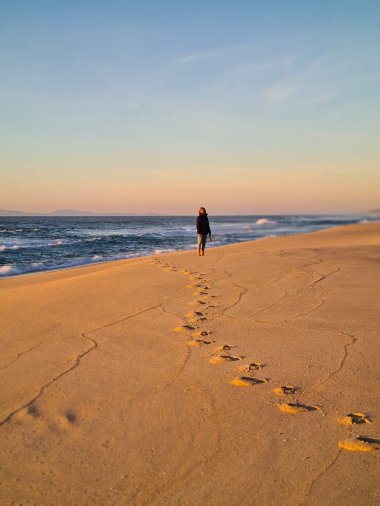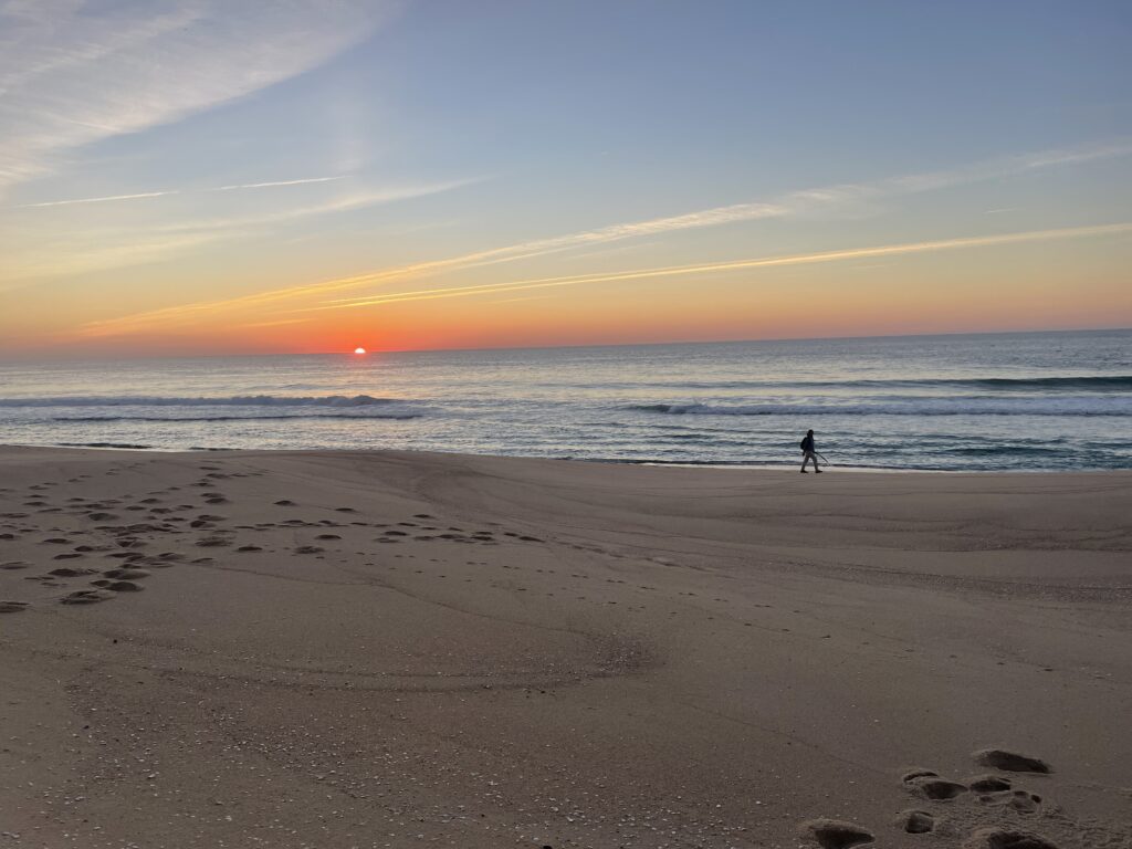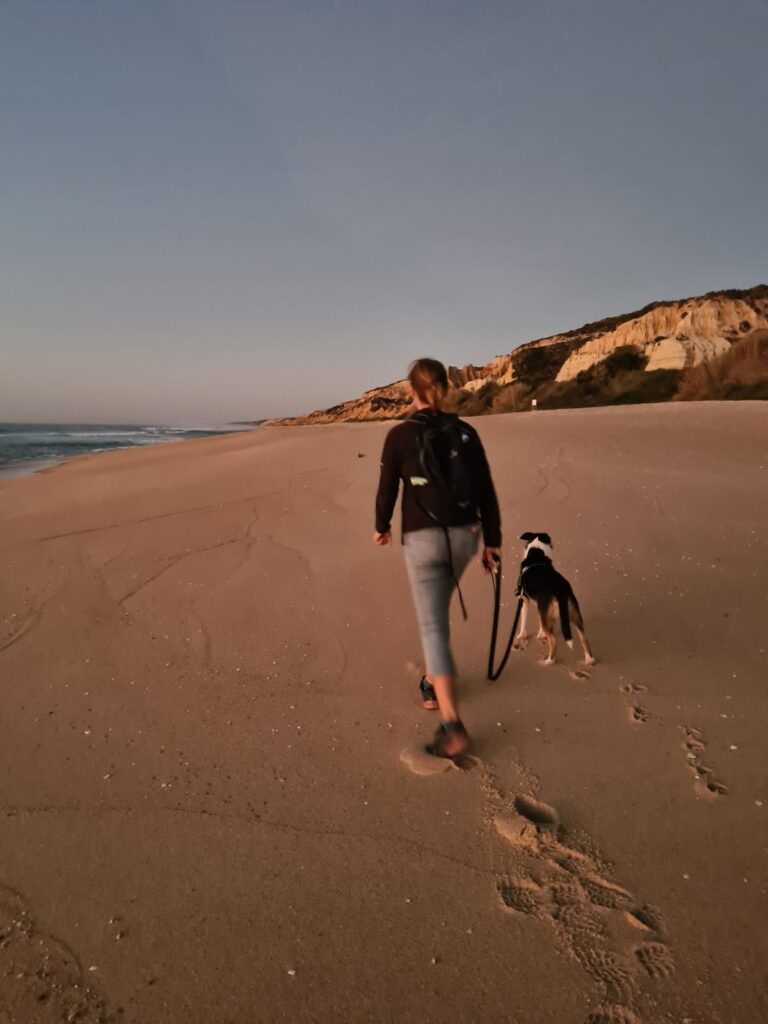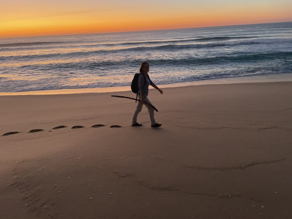 It turned out to be a really nice walk back, less roads more forest tracks and sand but it was 2 miles longer and the last 2 miles were along that beach I mentioned before that meant every step felt like we had lead boots on. We were so tired by now that we were hallucinating a landmark we knew meant we were nearly home, but when we got closer we would realise it wasn’t there…….the sun set and we eventually climbed the steps back up the cliff to our accommodation just as it got dark, absolutely shattered but with a great sense of achievement – 16 miles.