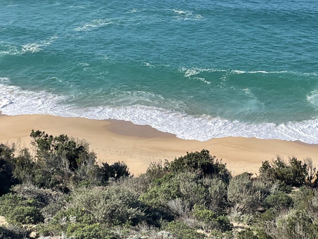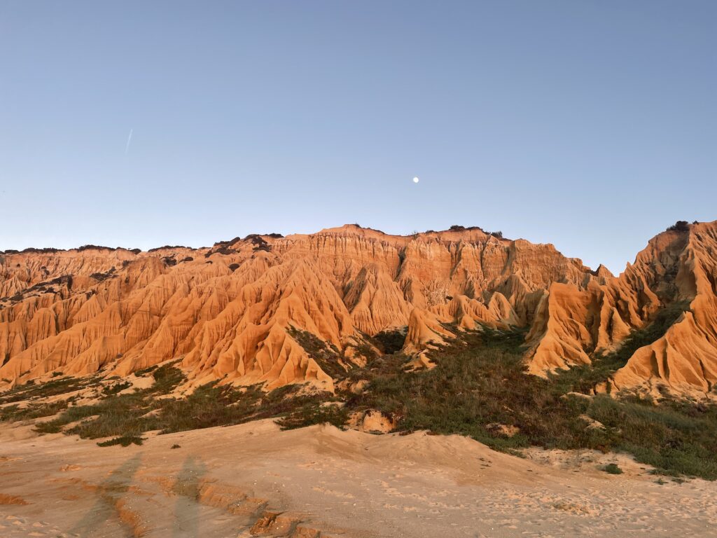 The house was in a nice setting with shared landscaped gardens and only a short walk to the cliff top where there was the most amazing views of the Atlantic Ocean and the long sandy beach that went on for about 40kms! It was untouched beauty with the orange rock sand cliffs that formed the most unusual shapes – they looked like rows of wizards with haggard faces and beards, in pointed hats and long wavy cloaks towering over the ocean. The sandstone looked smooth and you thought it would crumble in your hands but it was coarse to feel and when you walked along the beach it was impossible to be in a hurry as each footprint made deep indents into the sand and you felt like you would never get anywhere.