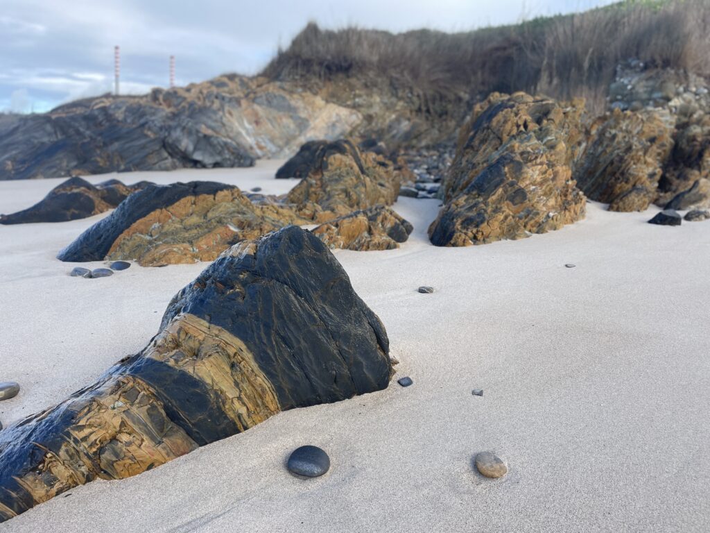 At Aljezur We took one of the roads off towards the sea that turned out to be 7km of patchy bumpy tarmac (at least there were no potholes). We had no idea what was at the end as we drove round bends and through interlocking lush green hills full of pine and eucalyptus trees to end up opening out to an expansive beach that was almost deserted. In front of the huge white sandy beach was an area of sand dunes and down one side was a lagoon river and a huge rock formation and slate cliff at the other. Whilst Bob got out his metal detector George and I went to explore.