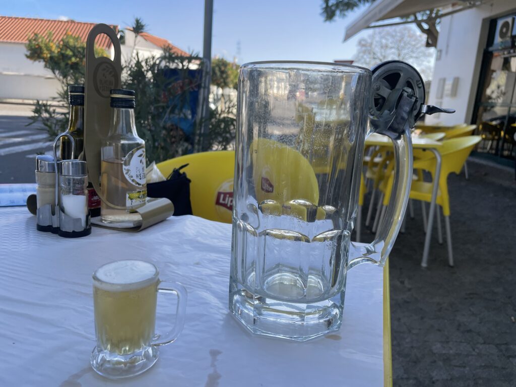 We drove to Serpa about 2 hours journey south west and got together with Frank, Taylor and their poodle for a late lunch. We found a local restaurant with a very friendly owner who served Bob a very large beer (1 litre) in a glass with a bell on it and said ‘Ring it when it is empty and I’ll bring you a free one’. Ring the bell he did and the owner came out with a glass the size of an expresso cup!