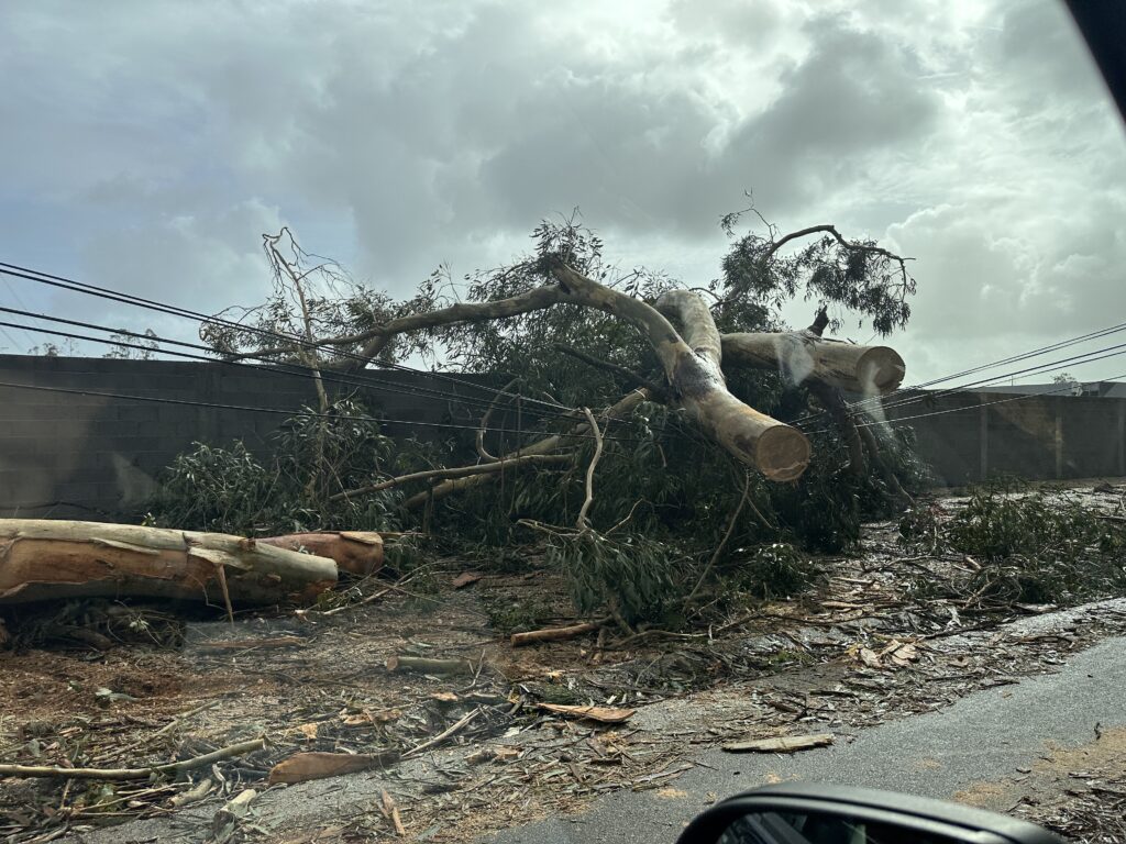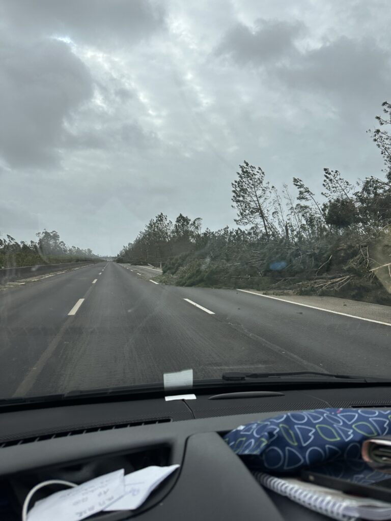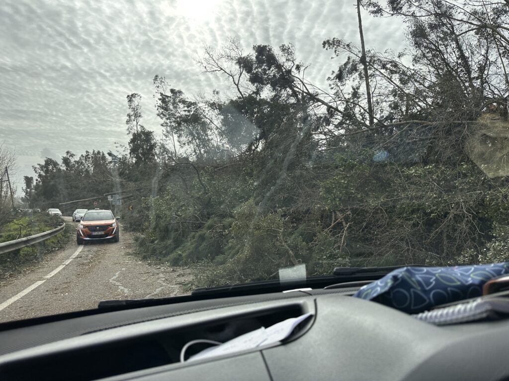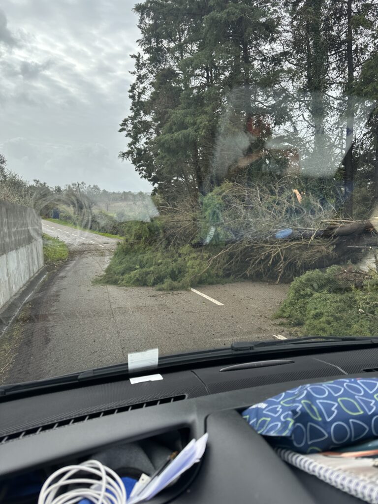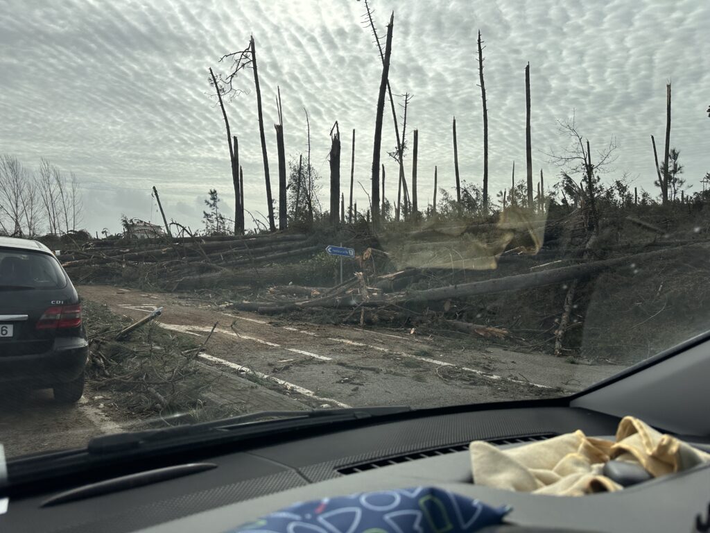 The following morning, we soon discovered what must have passed above us on our drive towards the coastline. This was to be one of the craziest drives of my life. I have never experienced such devastation –the force of the storm gradually revealed itself to us as the day went on. It started when a road was closed and we had to turn back – from then on we saw hundreds of trees literally snapped or uprooted along the roads, power lines down and lying across the road that we drove over, houses stripped of their roof tiles, glass shop fronts smashed, arctic lorries on their sides, a building merchant selling huge septic tanks with his tanks blown around like balloons and lying across roads and in fields, car show rooms with new cars smashed, bit of corrugated iron blown around like paper and huge road signs bent over double. There were turnings we tried to take that disappeared under the water making them impassable. This went on for hours and it took us a long time to get onto the motorway and away from the damage. Google maps was no help so I was literally following a map suggesting roads to try and we would drive carefully not knowing what would be round the corner. We realised how lucky we had been  – if we had been on the coast I’m not sure what danger we would’ve put ourselves into.